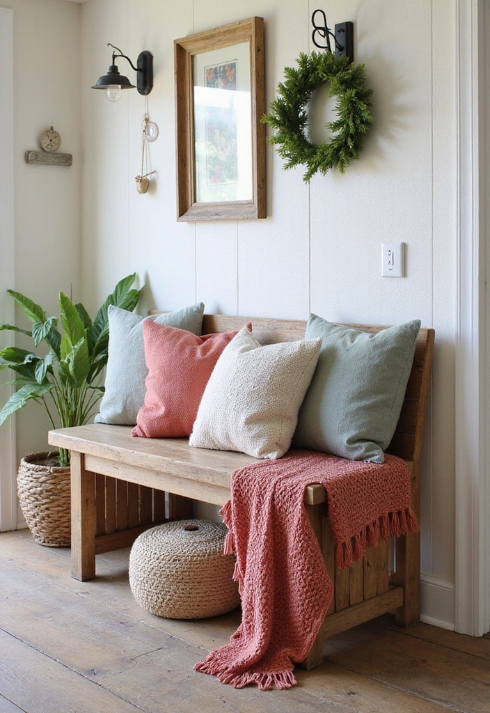 Incorporating a rustic bench into your entryway provides both seating and storage. This practical addition allows guests to remove their shoes comfortably while giving you a spot to place decorative pillows and throws.