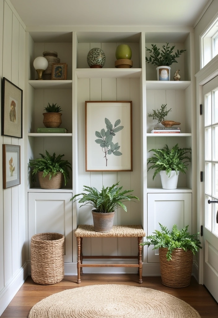 Open shelving creates an excellent opportunity to showcase your personality and style right from the entryway. Use rustic wooden shelves to display an array of decorative items, plants, or photo frames. This not only makes your entryway feel more personal but also practical, providing space for essentials like keys or mail.