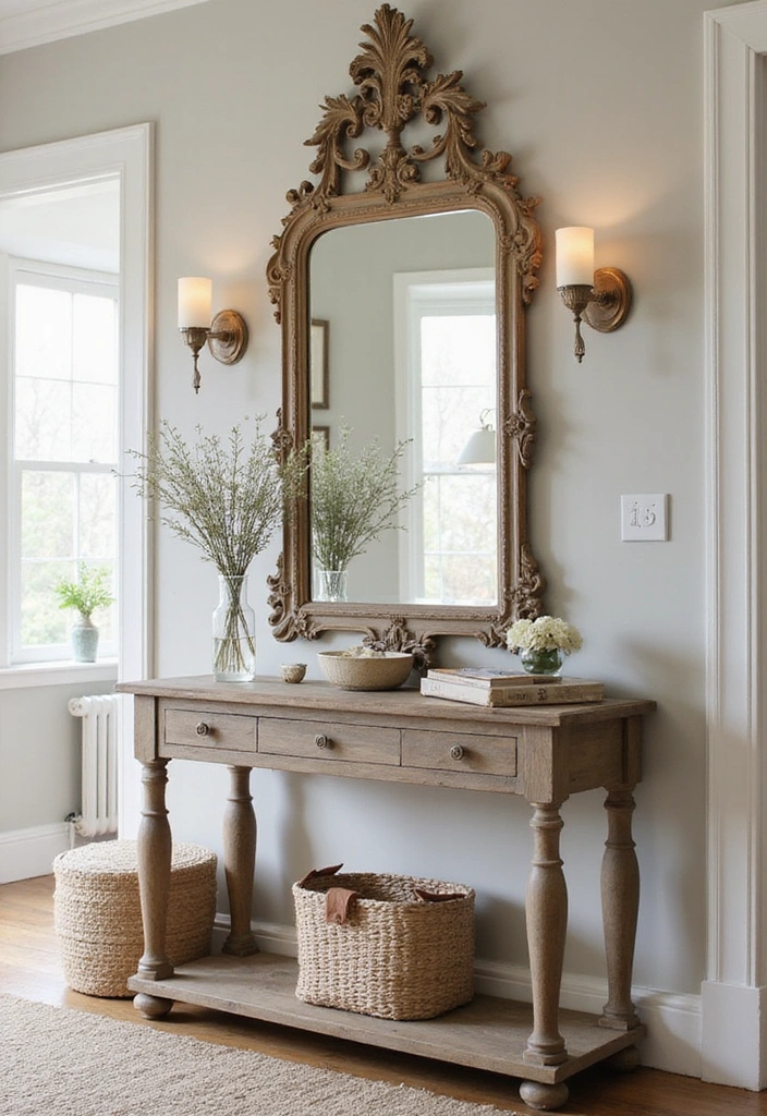 A vintage mirror can work wonders in making your entryway feel larger and brighter. Positioning a mirror opposite a window will reflect natural light, enhancing the inviting atmosphere. Choose a mirror with an ornate frame to add character and a touch of elegance.