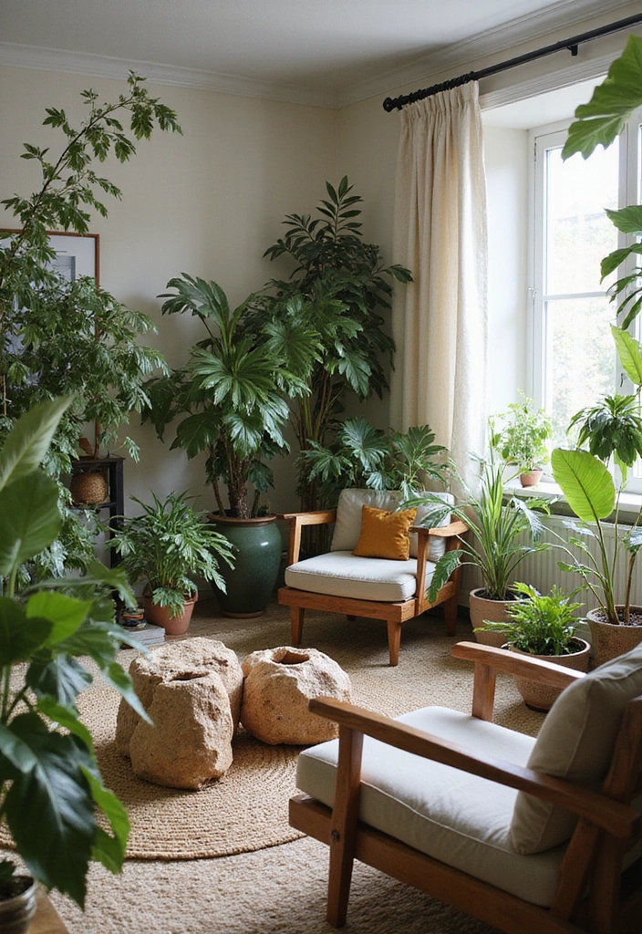In addition to plants, incorporating natural elements like wooden furniture or stone accents can evoke a sense of tranquility. A coffee table made from reclaimed wood or driftwood can serve as a stunning centerpiece, while natural stone coasters connect the outdoor vibes to your living space. This blend of organic materials creates a peaceful retreat that feels harmoniously balanced.