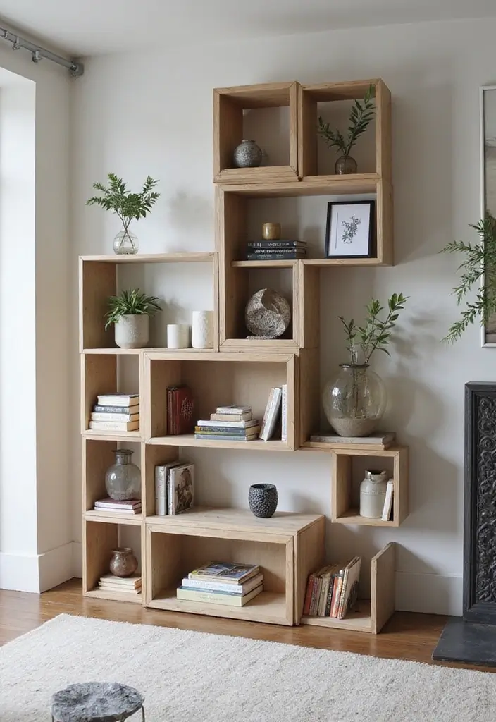 If you’re looking to turn your book storage into a piece of art, geometric shelving units are the way to go. These bold, modern designs come in various shapes like triangles, hexagons, or asymmetrical patterns. They not only provide unique storage solutions but also become an eye-catching centerpiece in your living space.