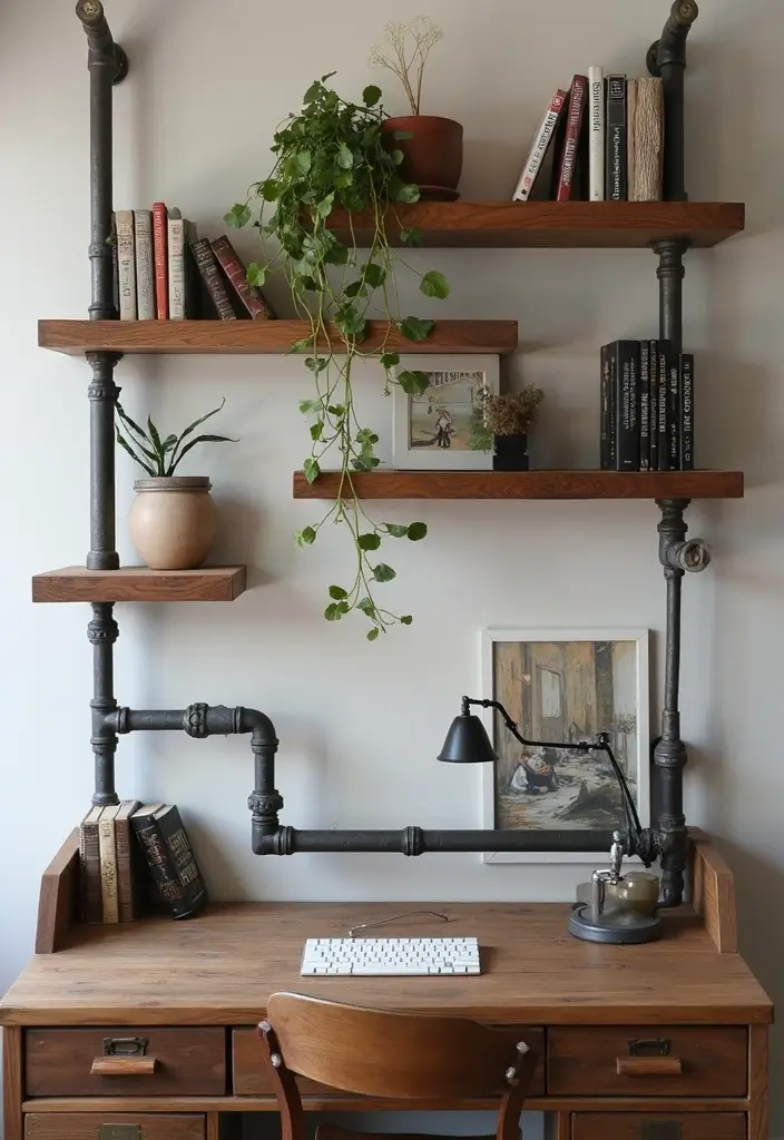 For a bold statement, industrial pipe shelves are a showstopper. These shelves combine raw materials, like wood and metal, to create a rugged, urban feel that’s perfect for modern lofts or eclectic homes. The mix of textures adds depth to your decor while providing the sturdiness needed to hold your favorite reads.