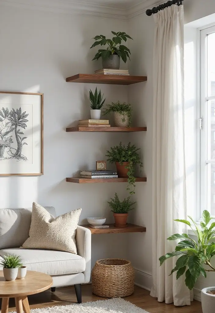 Corner shelves can transform even the most overlooked spaces into functional and stylish areas, perfect for showcasing your favorite reads and decor.