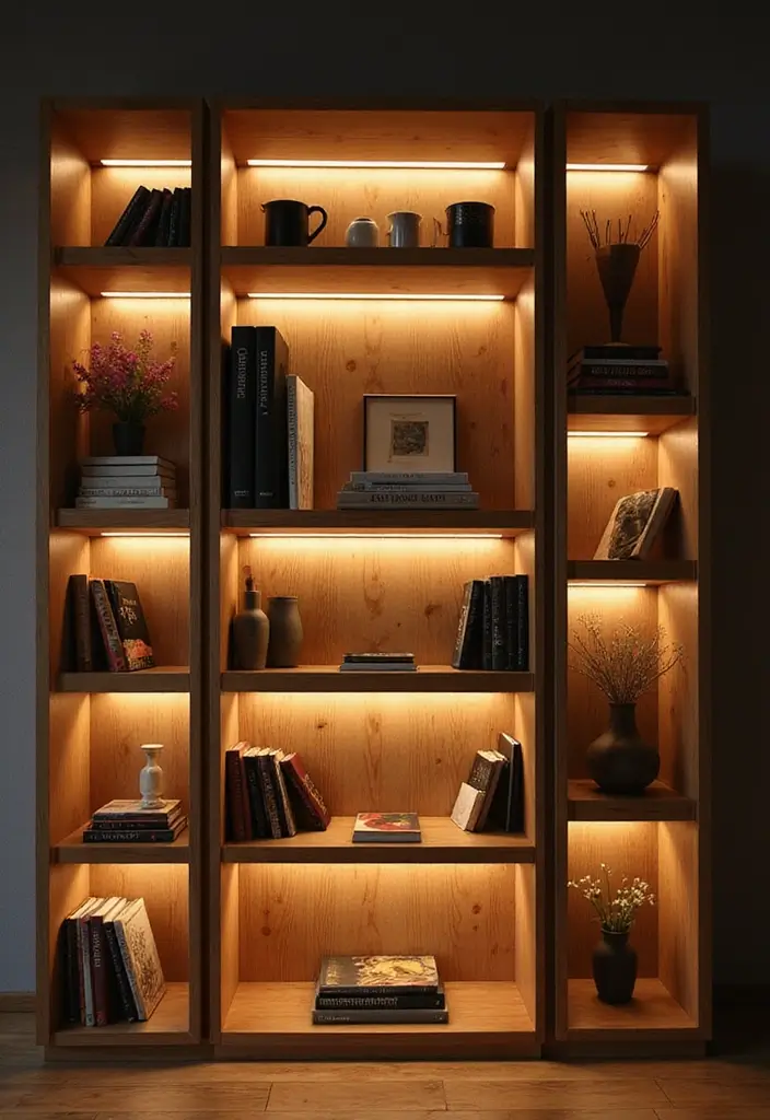 Modern shelving with built-in lighting not only showcases your books beautifully but also transforms your space into a cozy retreat.